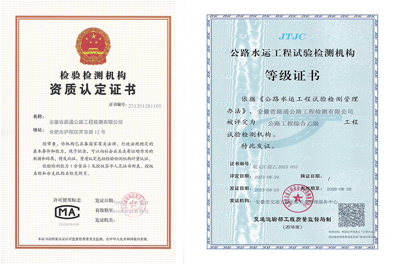 安徽省路通公路工程檢測有限公司成立于2003年7月。現(xiàn)擁有公路工程綜合乙級檢測資質(zhì)、排水管道檢測及評估作業(yè)能力III級作業(yè)證書,并通過了檢驗檢測機構(gòu)資質(zhì)認定。2021年12月16日,獲批“高新技術(shù)企業(yè)”。各專業(yè)試驗檢測人員配備齊全,具備開展集料、鋼材、土工、瀝青及瀝青混合料、水泥及水泥混凝土、砂漿、無機結(jié)合料、水、外加劑、磚以及路基路面、混凝土結(jié)構(gòu)物、基坑地基與基樁、橋梁結(jié)構(gòu)、交安設施、公路與橋梁技術(shù)狀況和城鎮(zhèn)排水管道檢測等多項試驗檢測的能力。