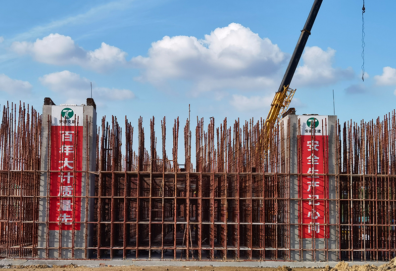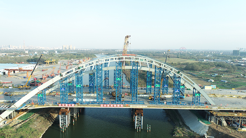 其中,廣德路跨南淝河段橋梁總長661米,由主橋、南北岸引橋三部分組成,主橋橋長230米,主梁采用55+135+45鋼箱梁,橋寬53米,采用非對稱無推力鋼拱橋,步履式頂推法施工,該橋梁目前為國內在建同類結構跨度最大鋼箱拱橋。另,橋梁大體積承臺8號墩混凝土8870立方,凈矢高27.5米,本工程拱肋為三維曲線造型,邊拱在平面的投影亦為曲線,拱腳為箱形,中間部位邊拱由兩個上拱箱和一個下拱箱組成,三個獨立拱箱在第一根吊桿之前合并并過渡到一個整體箱形截面,結構復雜,拱肋的精細化加工,梁拱關鍵節點的定位及安裝是本工程的重點,也是本工程的難點。南北岸引橋總長431米,采用上下行兩幅布置,單幅橋寬24.5米,采用現澆預應力混凝土連續箱梁結構。