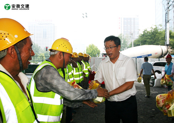 副市長寧波向奮戰在高溫下的工程建設者們表示感謝,給安徽交建一線員工送去了仁丹、風油精、肥皂、毛巾、礦泉水、綠豆等防暑降溫用品,并同現場的同志們一一握手。寧副市長強調指出,當前工程進入大干階段,又值高溫時節,希望項目施工方科學調度、合理安排,既保證工期,又確保安全生產,防止發生高溫中暑等事件。嚴格落實防暑降溫措施,對從事高溫作業和戶外作業的員工,要制定合理的作息制度。相關部門要根據各自職責,積極主動地做好服務保障工作,保障好每一位建設者的人身安全和健康。在得知項目工程進展順利后,寧副市長還詳細地了解了工地的避暑措施,并再三囑咐現場負責人,要加強安全管理、合理安排施工、避免強高溫時段室外作業、保障職工身心健康,并在確保工程質量和施工安全的基礎上,進一步加快項目建設進度,努力交上一份完美答卷。