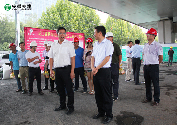 7月28日下午,合肥市副市長寧波在市重點局局長張家祥、副局長鄭浩、安徽省交通建設股份有限公司(以下簡稱安徽交建)總裁高楊等人的陪同下,蒞臨安徽交建長江西路與沿線道路立交工程項目施工現場,慰問奮戰在高溫一線的道路建設者們。