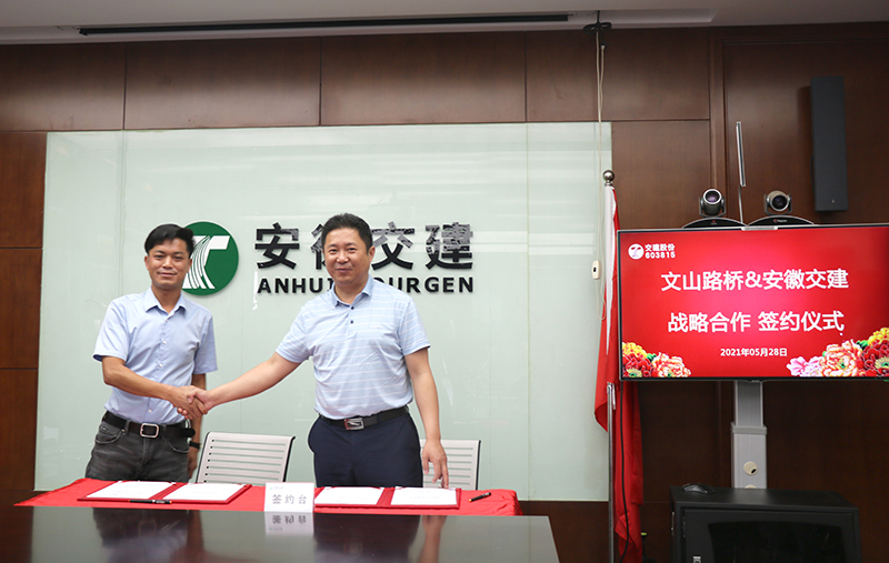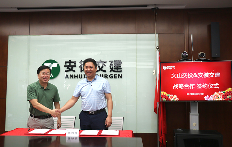 5月28日上午,安徽省交通建設股份有限公司與文山交通投資建設股份有限公司、文山路橋有限責任公司簽署了戰略合作協議。文山交投集團黨總支副書記、副總經理肖元靜,文山路橋公司董事長羅傳忠,交建股份黨委書記、董事長胡先寬等出席了簽約儀式。